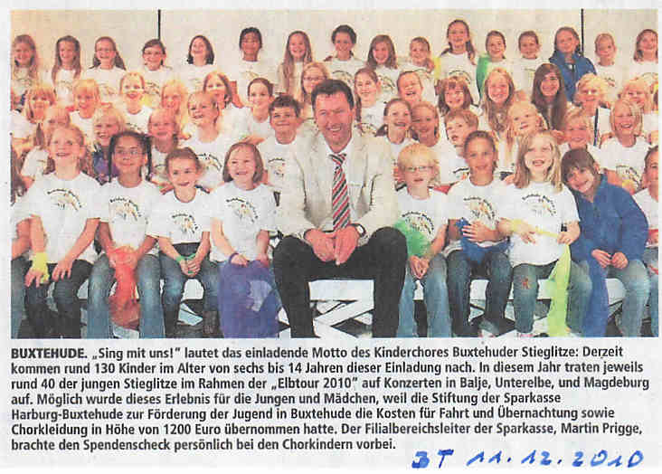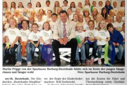Strahlende Gesichter bei Vorstand und Chorkindern der Buxtehuder Stieglitze - Während der letzten Chorprobe vor der Chorreise nach Magdeburg im Rahmen von Rolf Zuckowskis Elbtour 2010 überbrachte Herr Martin Prigge als Vertreter der Stiftung der Sparkasse Harburg-Buxtehude zur Förderung der Jugend der Stadt Buxtehude große Freude: Die Stiftung unterstützt den Verein mit einer großzügigen Spende von 1.200 €.