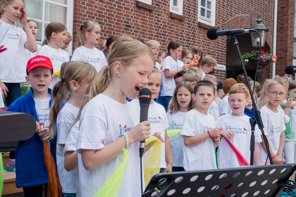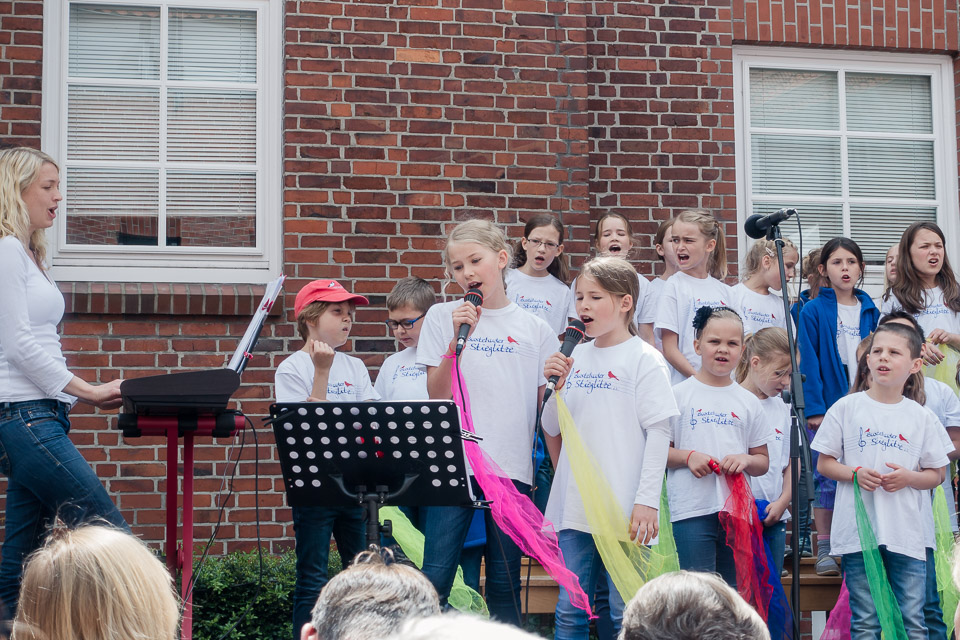 Das Kinderkunstfest ist wohl eins der Lieblingsfeste der Kleinen Stieglitze. Wie immer war die Bühne auch am 18. Juni wieder voll, und auch das Wetter war wieder einmal so richtig schön. Der "Sound" auf dem Stavenort ist immer besonders gut, und so haben alle den Auftritt sichtlich genossen. Die Solisten haben ihre Sache super gemacht, sowohl die ganz Kleinen als auch die Größeren wagten sich ans Mikrofon. Die Stimmung war wirklich gut und das "Belohnungseis" hinterher war dann der krönende Abschluss.