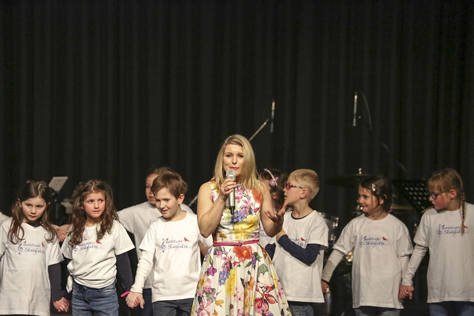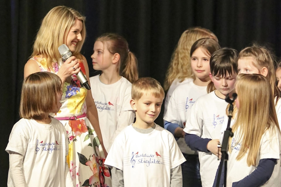 Los ging es bereits vor einiger Zeit damit, dass Nadine Sieben bei den Proben der Kleinen Stieglitze war und ihnen das Lied "Zaubermärchenland" und die Choreographie vorgestellt hatte. Das wurde dann in den letzten Wochen fleißig geübt, und es kamen dann tatsächlich 80(!) Kinder zusammen, die bei dem Auftritt mitmachen wollten! Das ist eine wahnsinnig große Zahl, die bei der Generalprobe am Samstag, einer weiteren Probe am Sonntag und während der gesamten Vorstellung unter Kontrolle gehalten werden musste: Wie kommen wir auf die Bühne? Und wie wieder runter? Wie stellen wir so viele Kinder auf? Wann müssen wir wo sein? Wie überbrücken wir Leerlaufzeiten? Fragen über Fragen, aber alle zusammen, mit Chorleiterinnen, den super eingestellten Kindern und einigen Helfern haben wir alles gemeistert - und das auch noch richtig gut! Aufregend war es auf so einer großen Bühne, und auf jeden Fall anstrengend für alle. Einige hatten spätestens gegen Ende ganz schön damit zu kämpfen, dass sie sich so lange konzentrieren sollten.