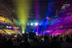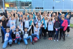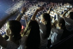Als wir in der Arena drinnen waren, sind wir eine Treppe hoch gegangen, die uns zu unserem Block O-19 (Oben Rand 19) führte. Etwas später gab es eine Generalprobe, die gut verlief. Dann hatten wir lange Pause. Um 18:45 Uhr sollten wir auf unsere Plätze, denn es war Einlass der Besucher und auch bald Showbeginn. Die Show verlief sehr gut und die Gäste fühlten mit. Für uns gab es auch noch einen "Gast": JULIA ENGELMANN. Mit ihr sangen wir ihr Lied "Das Lied", außerdem hatte sie zwei selbst geschriebene Gedichte vorgetragen. Als die Show vorbei war, sind wir zu unserer Sammelstelle gegangen, haben kleine Spielchen gemacht und wurden abgeholt. Wir alle waren sehr kaputt und waren spät im Bett. Trotz der Anstrengung war es ein schöner Tag!