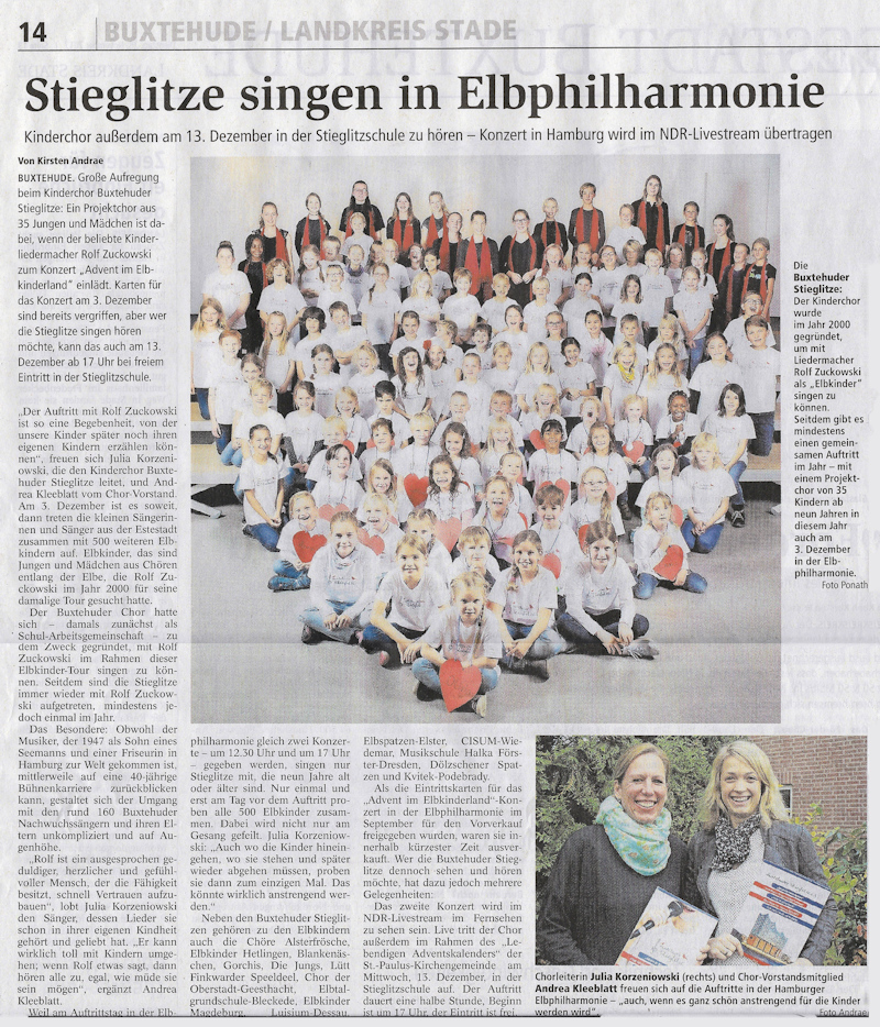 Aufgrund der Kontakte der Stieglitze zu Rolf Zuckowski ist es eine Selbstverständlichkeit, dass auch Stieglitze zu den Gründern des Vereins gehörten und dass wir an den Veranstaltungen des Vereins Elbkinderland teilnehmen.