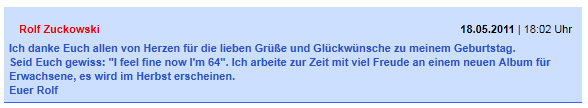 Im Gästebuch von www.musik-fuer-dich.de sind eine Reihe von Glückwünschen für Rolf Zuckowski eingegangen. Natürlich auch ein Gruß aus Buxtehude: