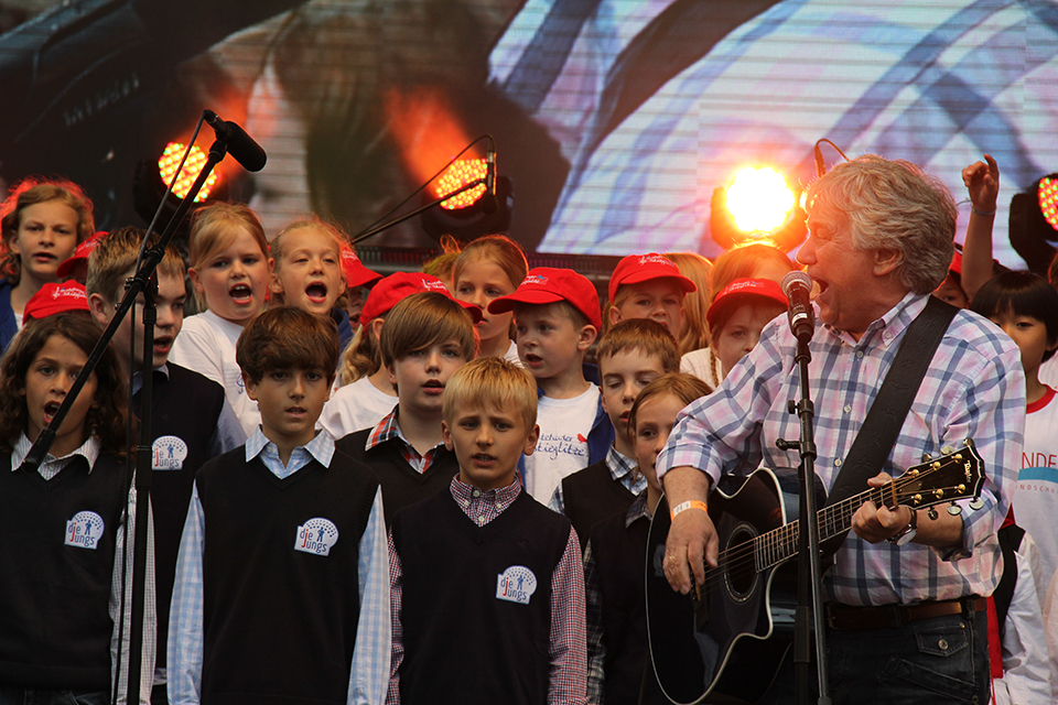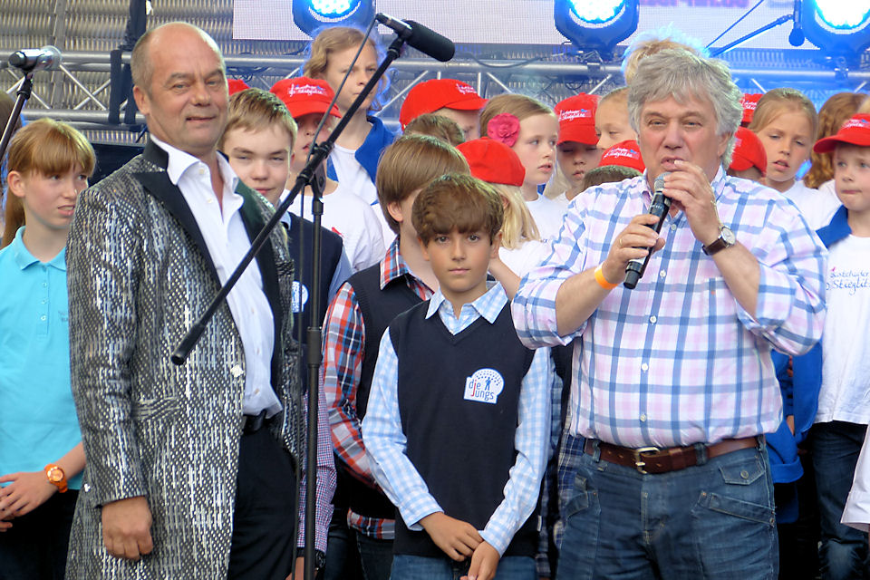 Es waren wahrscheinlich sogar noch mehr als die erwarteten 100 Chorkinder, die am 23. Juni am Spielbudenplatz den großen Elbkinderland-Chor bildeten und gemeinsam mit Rolf Zuckowski das hochkarätige ElbAllianz-Benefizkonzert eröffneten.
