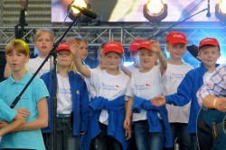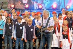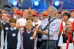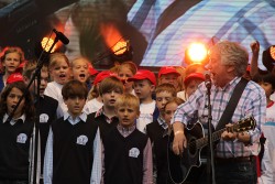 Noch haben es viele der jungen Chorkinder nicht begriffen, an welch legendärem Ort sie aufgetreten sind... Die Kinder waren aber sichtlich beeindruckt von der Riesenbühne und der gigantischen Technik samt 30m² Video-Leinwand hinter ihnen, auf der immer wieder Rolf und die Köpfe der Chorkinder eingeblendet wurden.