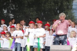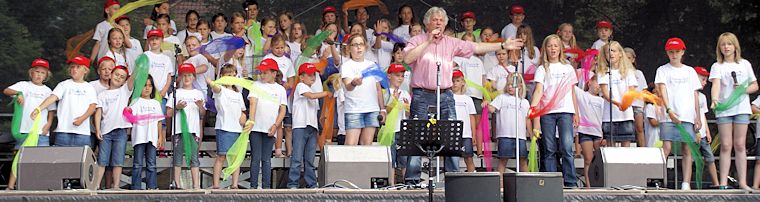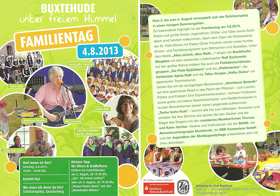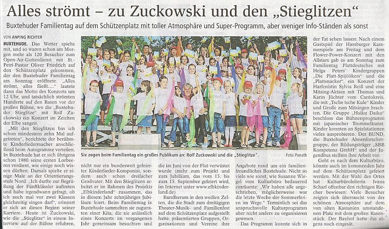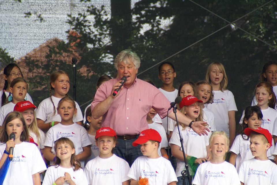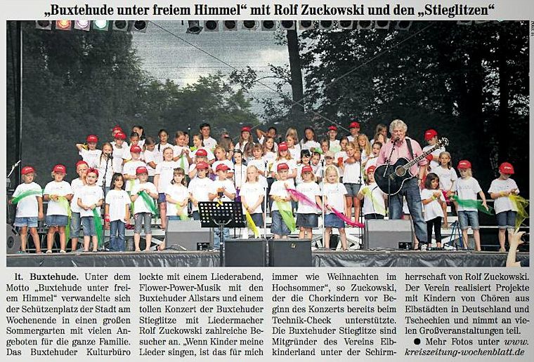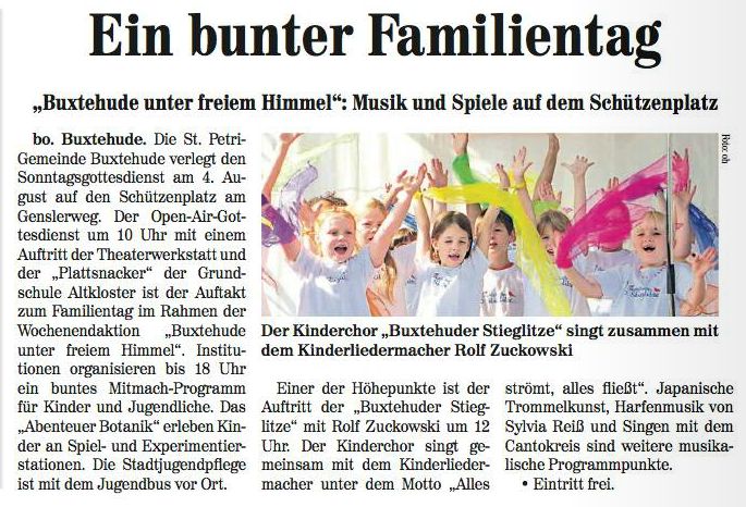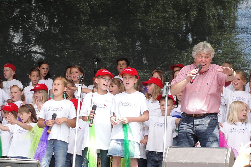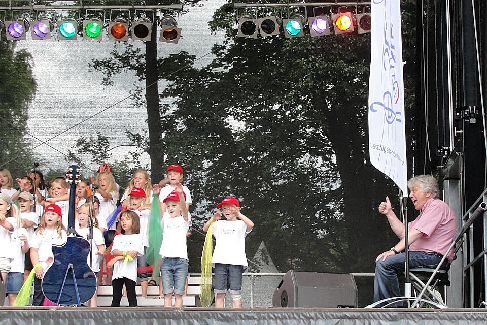 Schon viel früher als eigentlich im Programmablauf geplant betrat Rolf Zuckowski die Bühne beim Buxtehuder Familientag am 4. August 2013, den das städtische Kulturbüro als Veranstalter an einem tollen Standort zu einem großartigen Ereignis werden ließ. Nichts hielt den bekannten Liedermacher mehr im Schatten im Backstage-Bereich, denn "wenn Kinder meine Lieder singen, ist das für mich immer wie Weihnachten im Hochsommer"...