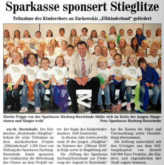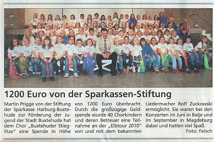 Strahlende Gesichter bei Vorstand und Chorkindern der Buxtehuder Stieglitze - Während der letzten Chorprobe vor der Chorreise nach Magdeburg im Rahmen von Rolf Zuckowskis Elbtour 2010 überbrachte Herr Martin Prigge als Vertreter der Stiftung der Sparkasse Harburg-Buxtehude zur Förderung der Jugend der Stadt Buxtehude große Freude: Die Stiftung unterstützt den Verein mit einer großzügigen Spende von 1.200 €.