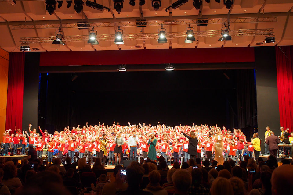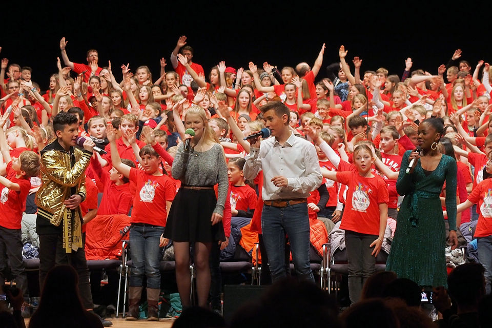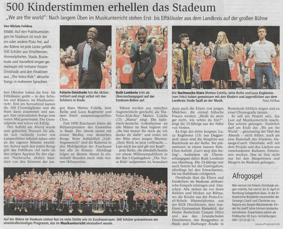 Es war ein großartiges Event, für das wir dem Organisator Folarin Omishade und seinem Team sowie der Band herzlich danken! Mehrere hundert Kinder und Jugendliche aus verschiedenen Schulen und Chören des Landkreises traten gemeinsam mit jungen Stars aus "THE VOICE KIDS" und "THE VOICE" im Stadeum beim Chor-Event "WE ARE THE WORLD" auf.