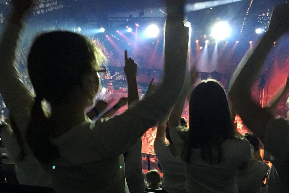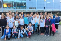 Als wir in der Arena drinnen waren, sind wir eine Treppe hoch gegangen, die uns zu unserem Block O-19 (Oben Rand 19) führte. Etwas später gab es eine Generalprobe, die gut verlief. Dann hatten wir lange Pause. Um 18:45 Uhr sollten wir auf unsere Plätze, denn es war Einlass der Besucher und auch bald Showbeginn. Die Show verlief sehr gut und die Gäste fühlten mit. Für uns gab es auch noch einen "Gast": JULIA ENGELMANN. Mit ihr sangen wir ihr Lied "Das Lied", außerdem hatte sie zwei selbst geschriebene Gedichte vorgetragen. Als die Show vorbei war, sind wir zu unserer Sammelstelle gegangen, haben kleine Spielchen gemacht und wurden abgeholt. Wir alle waren sehr kaputt und waren spät im Bett. Trotz der Anstrengung war es ein schöner Tag!
