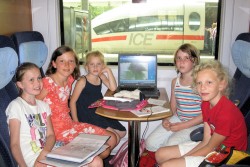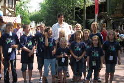 Celine, Lavinia, Johanna, Lene, Melina und Noria fuhren mit Chorleiterin Roswitha Cramer-Kölzer und als Begleitung Silke Husmann, sowie sechs Mitgliedern der Speeldeel nach Rust in den Europapark. Nach langer Zugfahrt fanden gleich am Nachmittag und Abend eine Probe und die Generalprobe zusammen mit Rolf Zuckowski und seinen Musikern Marit Hermann (Flöte) und Heiko Quistorf (Akkordeon) statt. Wie wir ihn bisher immer kennengelernt hatten, gelang es Rolf auch diesmal mit seiner netten, unkomplizierten Art, den Kindern die Scheu zu nehmen und sie perfekt auf den Auftritt vorzubereiten.