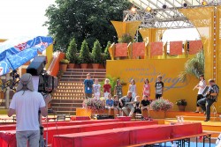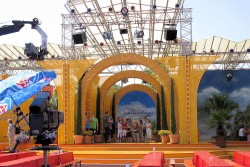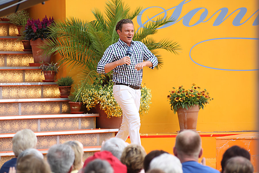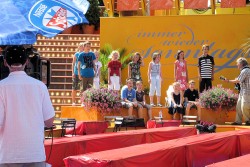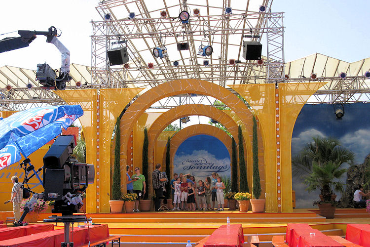 Danach ging es direkt zur Unterkunft ganz in der Nähe des Freizeitparks. Nach einer aufregenden Nacht, nicht nur wegen eines starken Unwetters mit Blitz und Donner, ging es nach dem Frühstück per Shuttleservice zur Livesendung unter freiem Himmel. Im Freizeitparkbereich hatten sich schon einige Hundert Zuschauer bei bestem Sommerwetter eingefunden, die vom Moderator Stefan Mross herzlich begrüßt wurden. Unter den Zuschauern auch Tanja, Daniel und Carsten Hahn, die mit Aufregung und Stolz auf den Auftritt warteten. Als siebter "Music-Act" kamen dann Rolf und die Stieglitze an die Reihe.