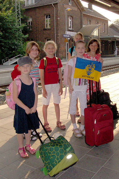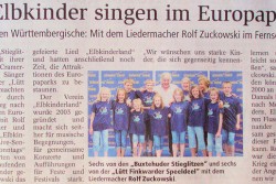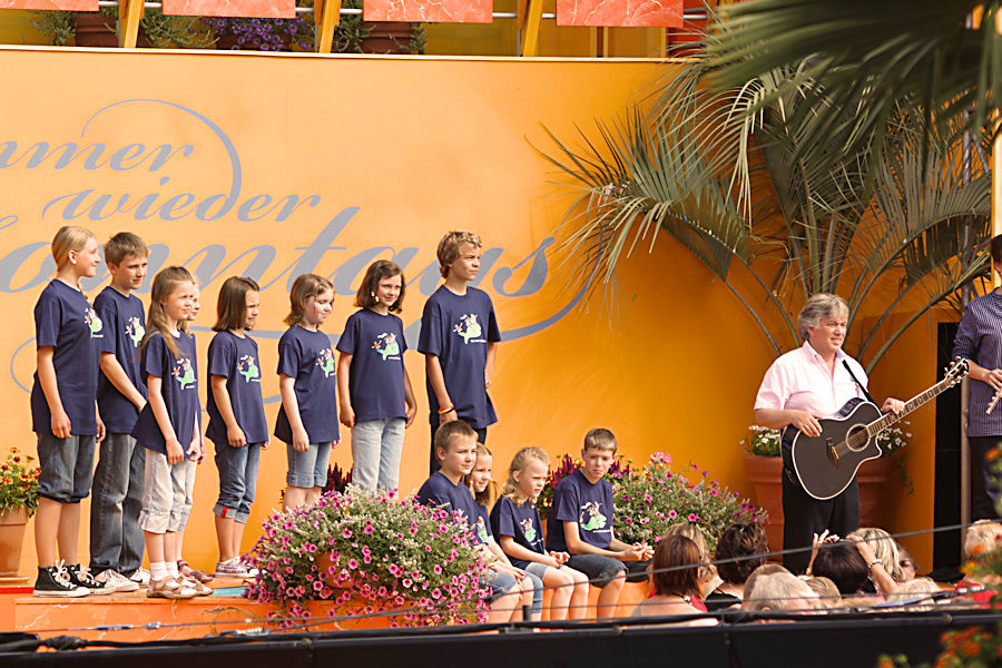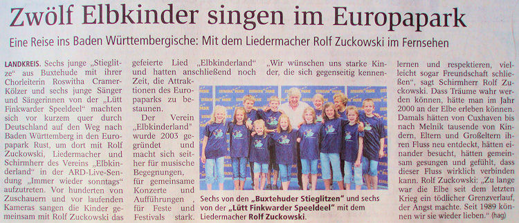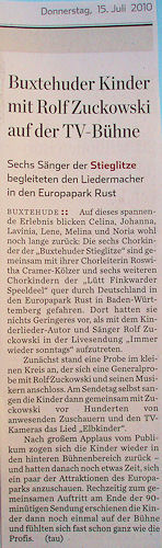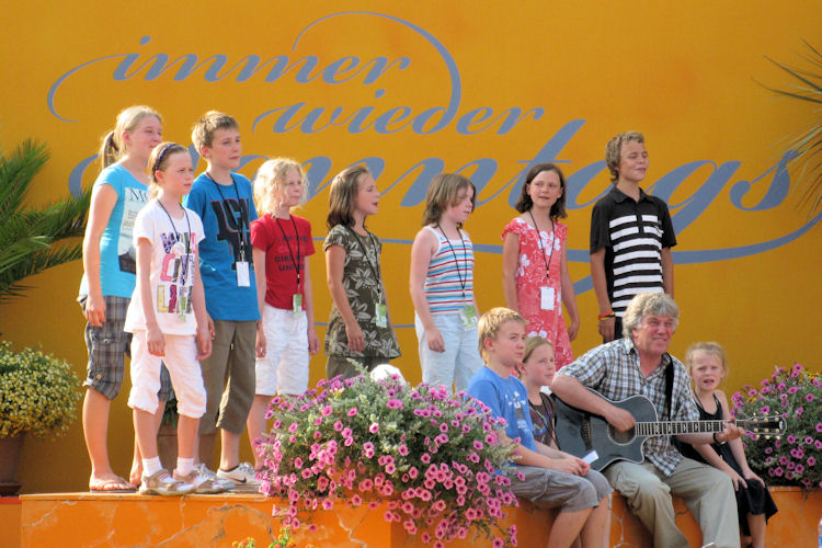 Bei hochsommerlichen Temperaturen starteten am Samstag morgen sechs "Buxtehuder Stieglitze" gemeinsam mit sechs Kindern der "Lütt Finkwarder Speeldeel" quer durch Deutschland, um am Sonntag, den 11. Juli, zusammen mit Rolf Zuckowski im Rahmen der ARD-Livesendung "Immer wieder sonntags" aufzutreten.