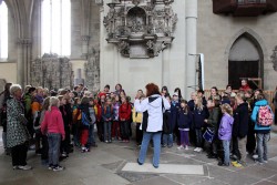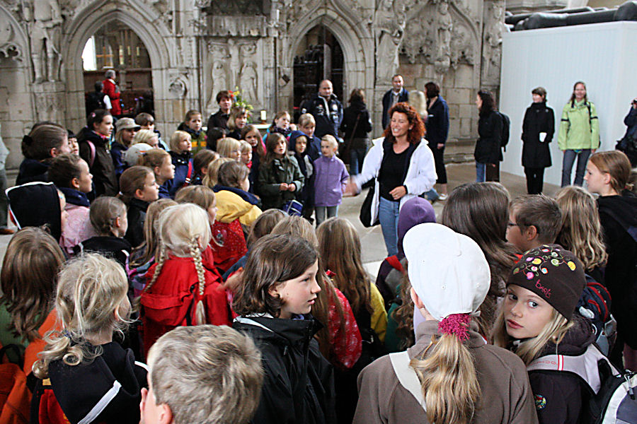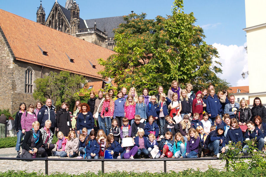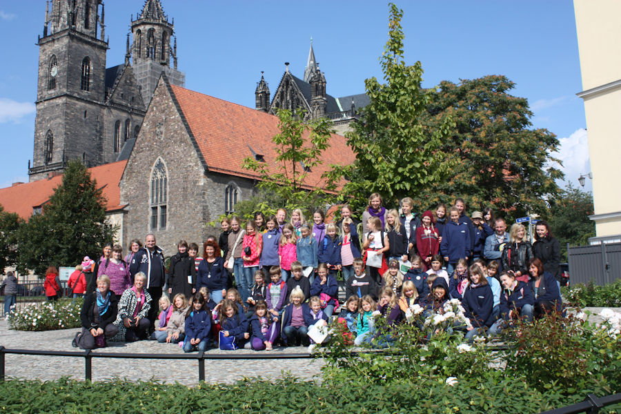 Um 8.00 Uhr gibt es Frühstück, anschließend 45 Min Busfahrt bis zum Magdeburger Dom. Hier werden wir von den Magdeburger Elbkindern und ihrer Chorleiterin Britta Meier und vielen Eltern herzlich empfangen. Im hohen Dom singen wir zusammen im Kanon – eine tolle Akustik.
