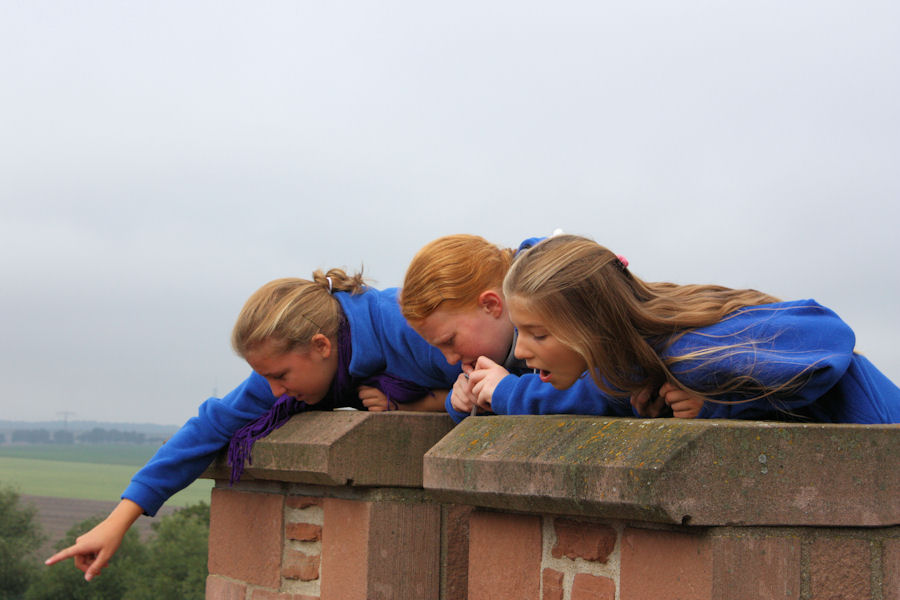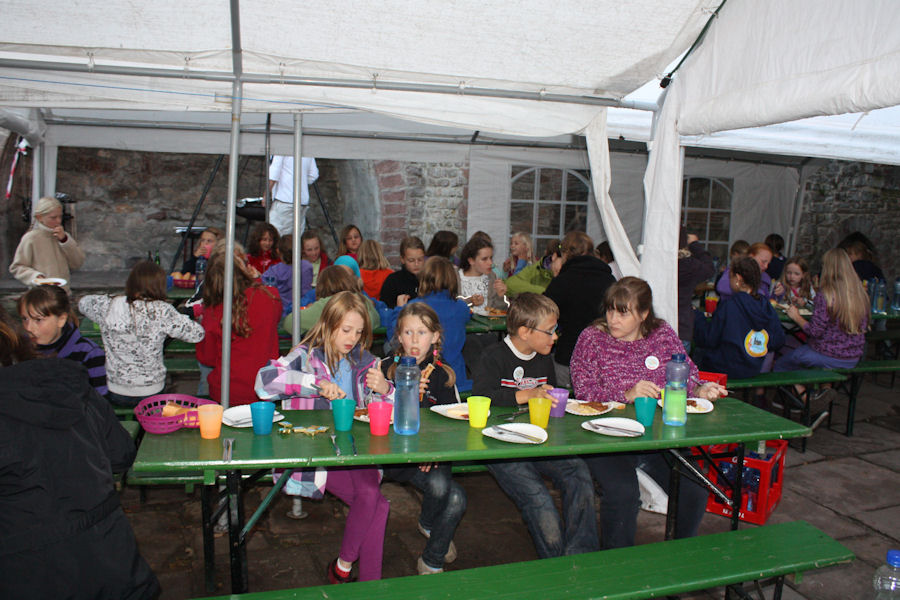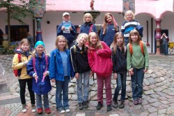 Eine alte große Burg wie bei Harry Potter, mit Streichelzoo im ehemaligen Burggraben. Wir wohnen in gemütlichen Zimmern auf drei Etagen im Gelben Flügel. Über eine große breite Holztreppe im Hauptschloss erreichen wir unseren Speisesaal im 3. Stock. Als Selbstversorger ist dank unserer großen Stieglitze das Abendessen schnell hergerichtet. Wer sein Bett bezogen hat, darf in den Streichelzoo und in die Disco. Um 22.00 Uhr liegen alle müde in ihren Betten. Noch eine Gute-Nacht-Geschichte und ein bisschen Bettgeflüster, dann fallen schnell die Augen zu.