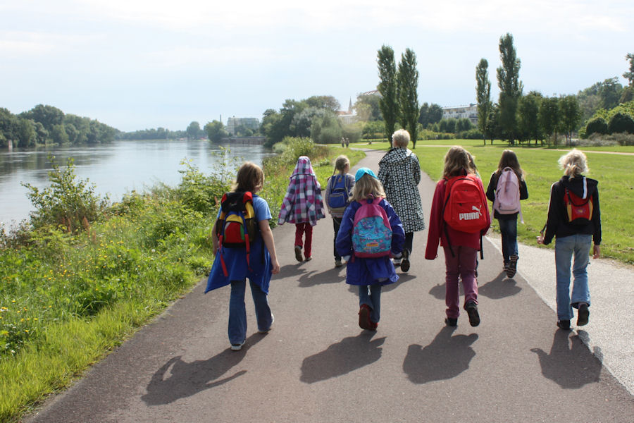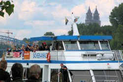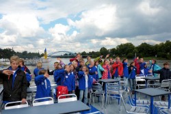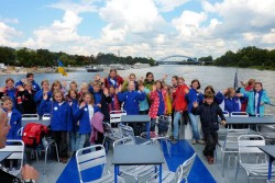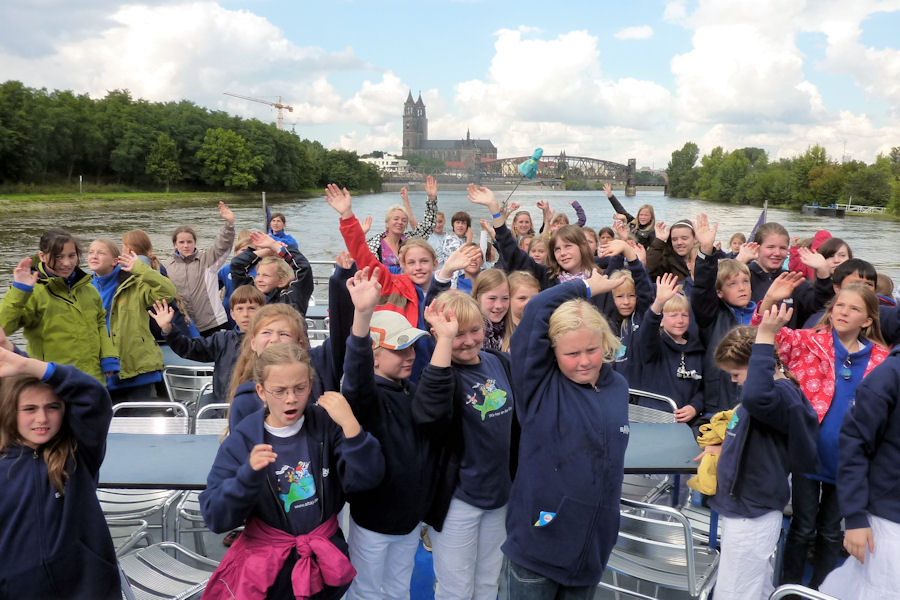 Um 14.30 Uhr eilen wir in Chorkleidung und Regenjacken zum Bus, der uns ins Stadtzentrum bringt, dort wartet eine Überraschung auf uns: Alle Chorkinder (Magdeburger Elbkinder ~ Brunsbüttler Elbkinder ~ Buxtehuder Stieglitze ~ Rošták aus Přelouč) sind eingeladen zu einer gemeinsamen Dampferfahrt vom Dom bis zum Mückenwirt.