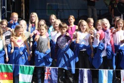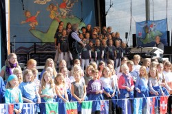 Direkt an der Anlegestelle erfuhr das Elbkinderlandspiel lebendigen Zuspruch und stimmte die zahlreichen Besucher auf der letzte Konzert unserer Reise ein. Noch einmal überwand Rolf mit den tschechischen Kindern im Duett die Zungenbrecher in dem Lied "Papaja" und noch einmal konnten alle Zuhörer in den mehrstimmigen Gesängen und verzaubernden Melodien dieses wundervollen Chors schwelgen.