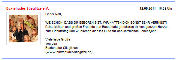 Im Gästebuch von www.musik-fuer-dich.de sind eine Reihe von Glückwünschen für Rolf Zuckowski eingegangen. Natürlich auch ein Gruß aus Buxtehude:
