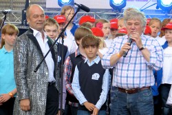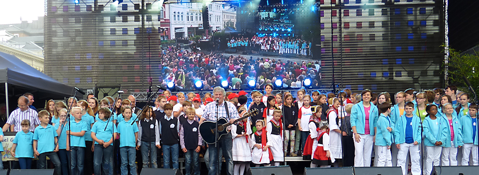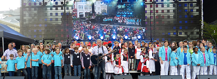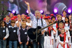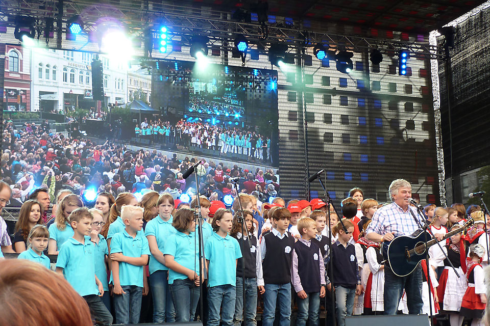 Noch haben es viele der jungen Chorkinder nicht begriffen, an welch legendärem Ort sie aufgetreten sind... Die Kinder waren aber sichtlich beeindruckt von der Riesenbühne und der gigantischen Technik samt 30m² Video-Leinwand hinter ihnen, auf der immer wieder Rolf und die Köpfe der Chorkinder eingeblendet wurden.