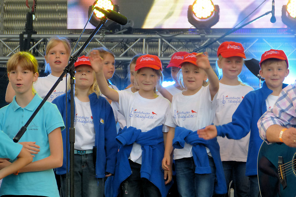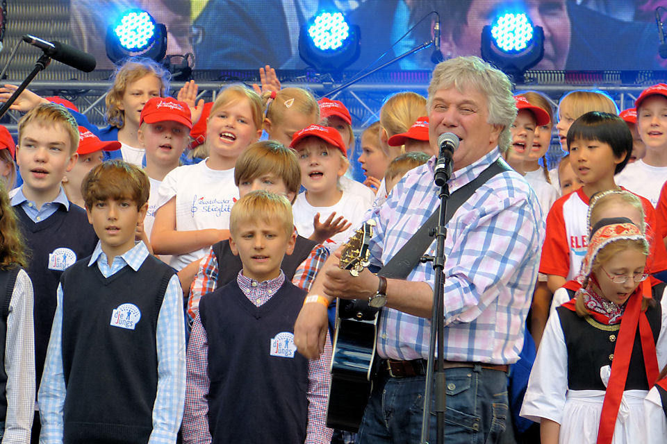 Es waren wahrscheinlich sogar noch mehr als die erwarteten 100 Chorkinder, die am 23. Juni am Spielbudenplatz den großen Elbkinderland-Chor bildeten und gemeinsam mit Rolf Zuckowski das hochkarätige ElbAllianz-Benefizkonzert eröffneten.