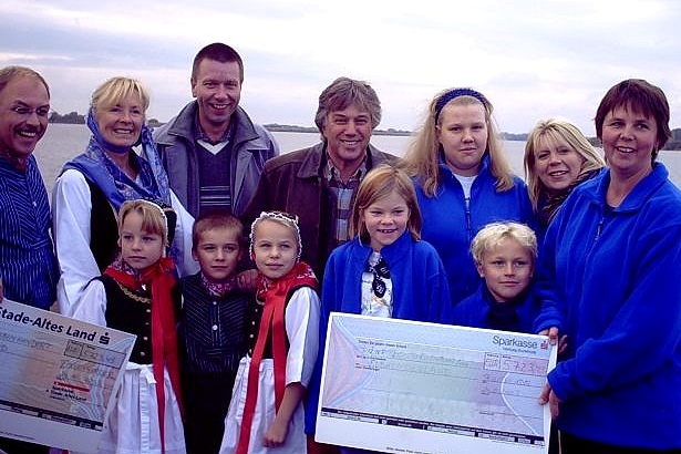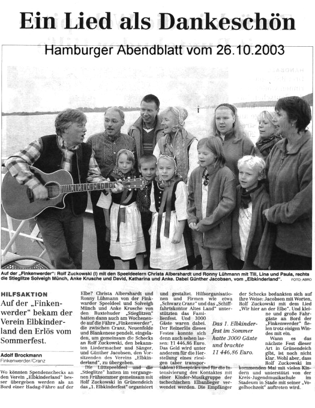 Eine weitere Freude war es, als die Organisatoren nach dem Kassensturz dem Verein Elbkinderland e.V. den Reinerlös der Veranstaltung überreichen konnten. Stilecht wurden am 24.10.2003 mitten auf der Elbe Schecks mit einen Gesamtwert in Höhe von 11.446,86 € an Rolf Zuckowski und Günter Jacobsen vom Elbkinderland e.V. übergeben.